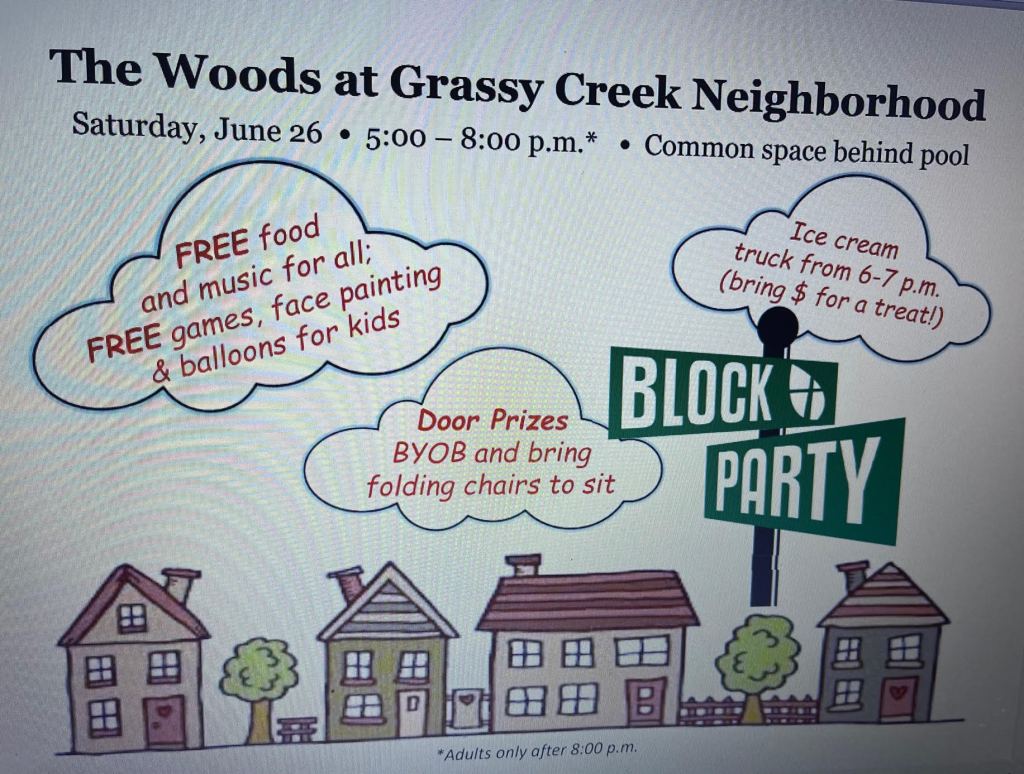 Neighborhood event on June 26, 2021. 100% neighbor planned without sponsorship from the HOA. Please send an email to the WGC email, and we can forward to the planners to get an accurate attendee count! Hope to see you all there!
